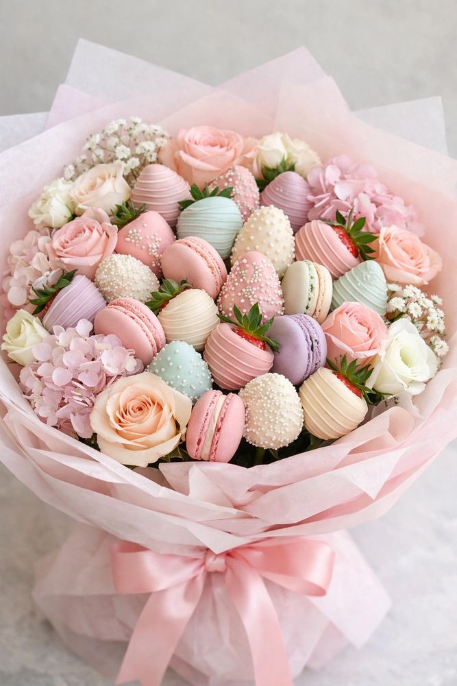 Exquisite bouquets with flowers, chocolate covered strawberries, macarons, and other delights.